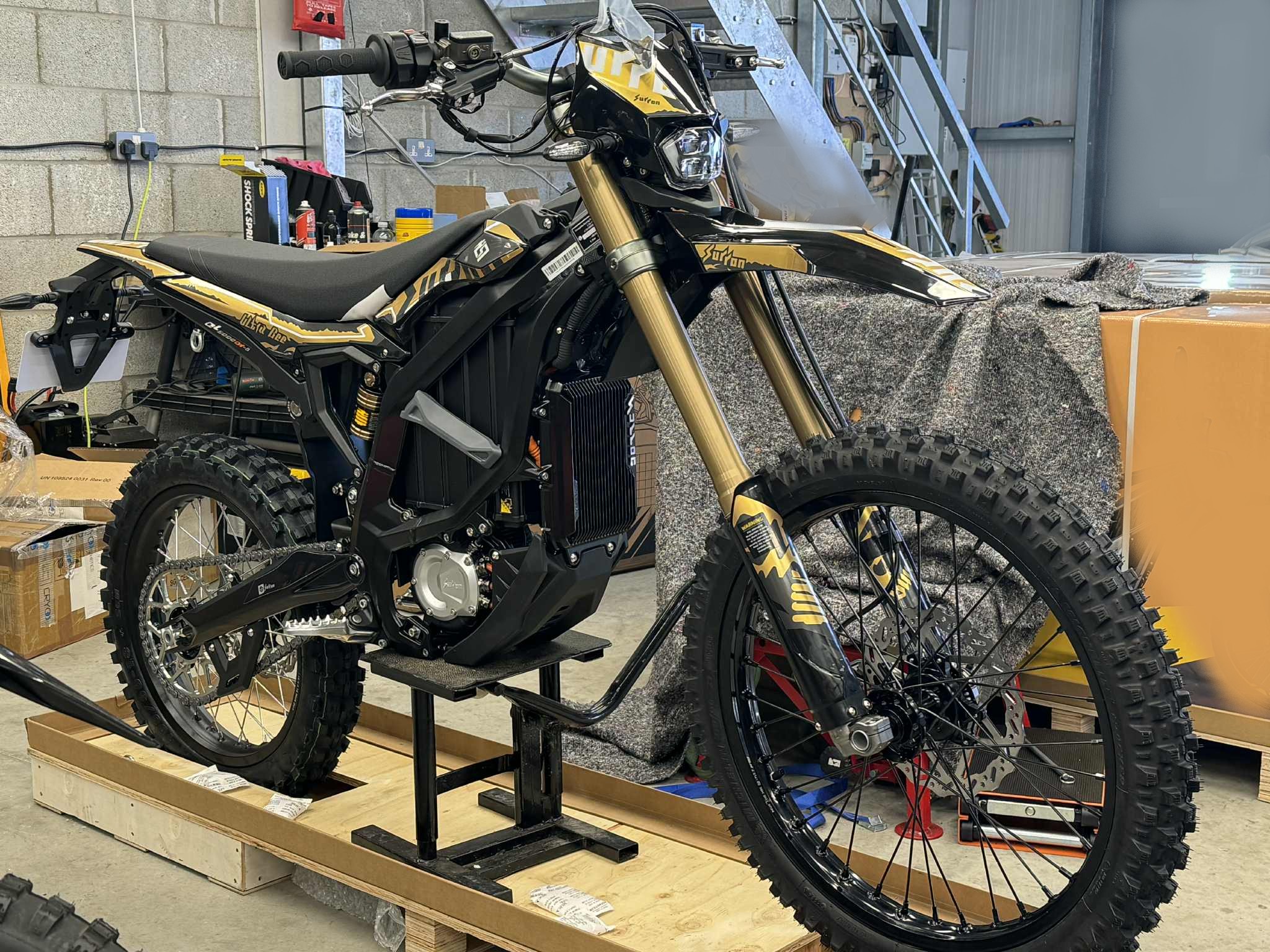 - Bike in workshop photo has our aftermarket 21″ wheel available here: https://electroncycles.com/product/sur-ron-ultra-bee-front-wheel-21-x-1-6-all-black/