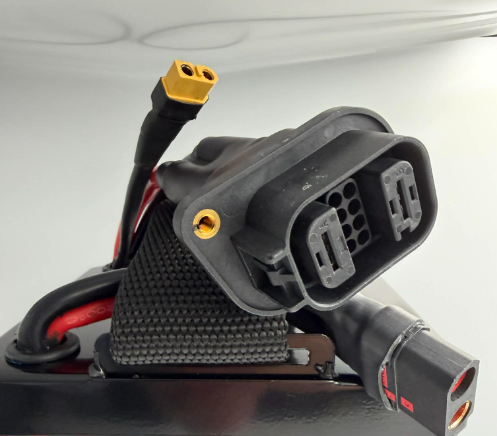 The main Talaria battery to controller and battery to bike connectors we use are a 2 x QS8 on a heavy duty 6 AWG cable. This allows higher power flow and less resistance than a standard cable and connector. We supply a free upgraded high power loom with the battery.